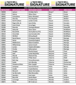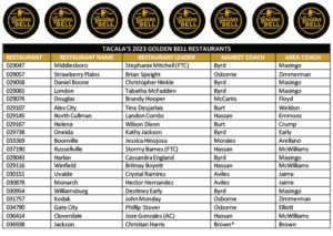 When Taco Bell classifies a restaurant as a Signature Premier Restaurant that means it has a special characteristic by which it can be identified and in this case the characteristic is EXCELLENCE.  We are proud and honored that 33 Tacala restaurants have been identified as SIGNATURE PREMIER RESTAURANTS. These restaurants have excelled at delivering best-in-class service, winning culture, and people development ON TOP of serving delicious food from open to close. Even more elite are the 20 Tacala Signature Premier Restaurants and two Tacala Area Coaches that were named by Taco Bell as 2023 GOLDEN BELLS winners which is the Best of the Best! How and why these 33 restaurants achieve this standard can help everyone on the march to the 2024 Signature Premier and Golden Bell restaurants.